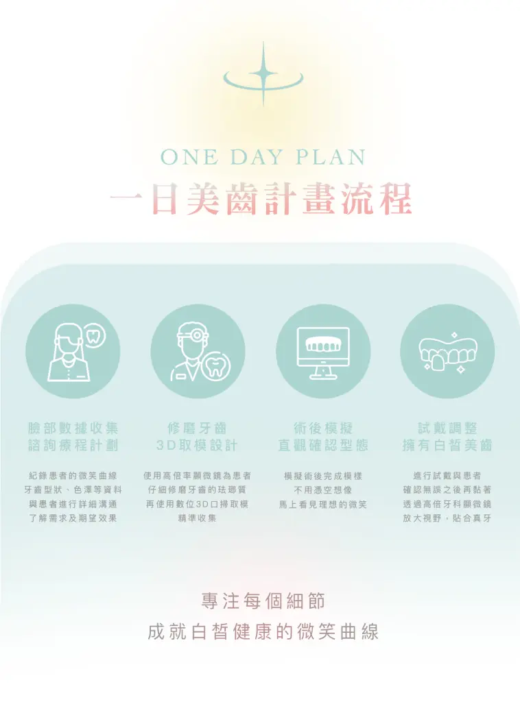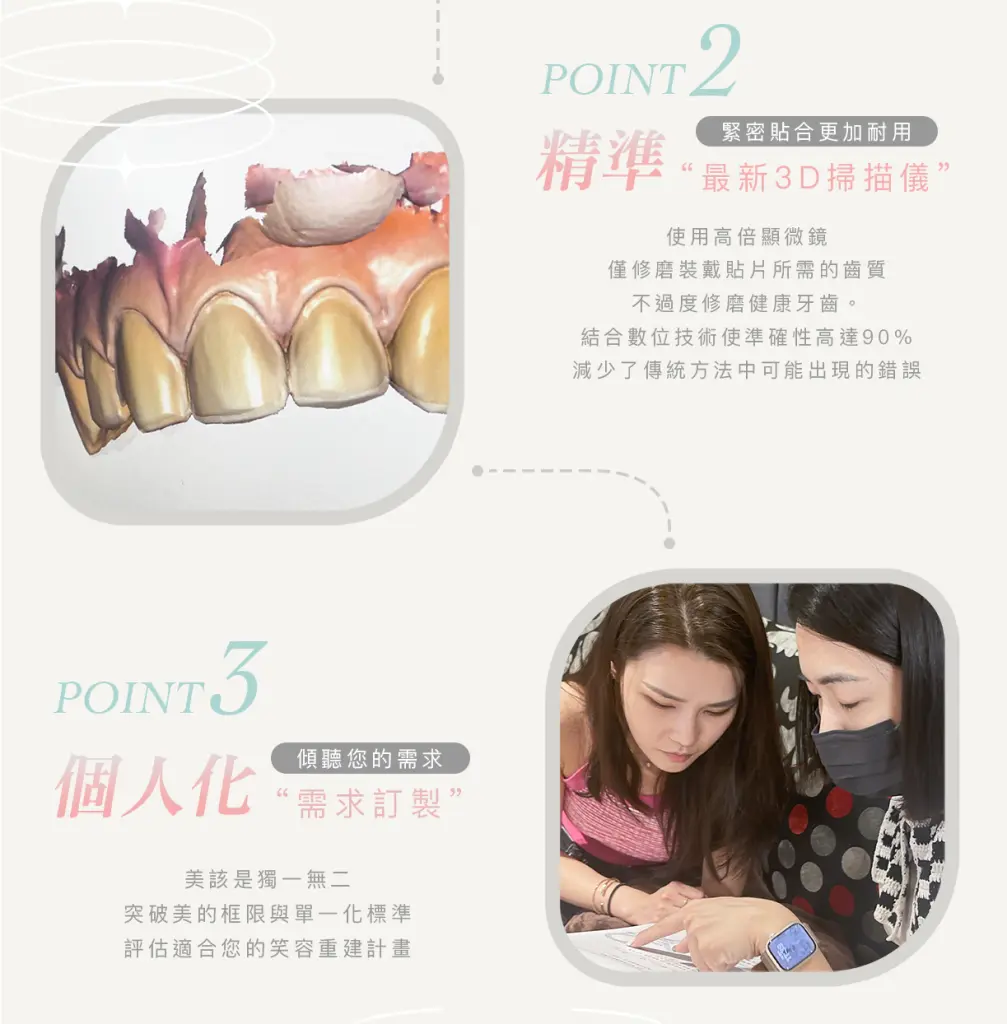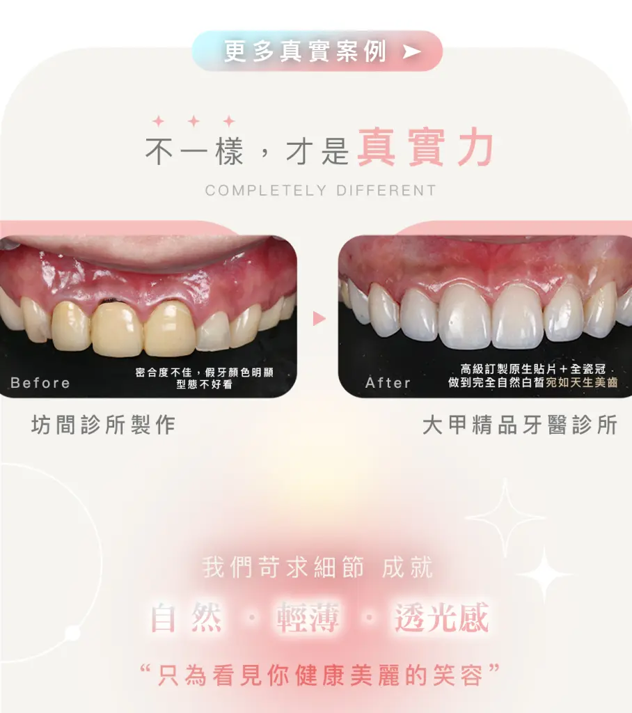 傳統的假牙製作,通常是利用灌模、印模取得牙齒外型,並與牙技所配合製作、修改,流程耗時繁雜。大甲精品牙醫診所打造數位美齒中心,透過高科技數位設備,可在短時間內,為病患量身製作堅固、耐用又美觀的假牙;無論是陶瓷美齒貼片、全瓷冠、3D齒雕,在這裡都能又快、又精準地完成。 立即預約 數位牙科服務的優勢 3D電腦輔助設計 牙醫師透過3D模型,可更加了解病人口腔型態,並藉由軟體模擬、及時修正,精確地為病人量身設計假牙。 當日完成 大甲精品牙醫假牙在院內完成製作,以3D數位研磨機,只需10分鐘即可完成假牙的製作。 讓假牙更耐用 透過數位儀器精準掃描、製作的假牙,能與真牙緊密貼合,避免因縫隙卡菜渣、形成清潔死角導致蛀牙。 選擇大甲精品牙醫,讓我們利用最新數位科技,幫助您恢復美麗笑容。 一日美齒 陶瓷美齒貼片 全瓷冠 3D齒雕